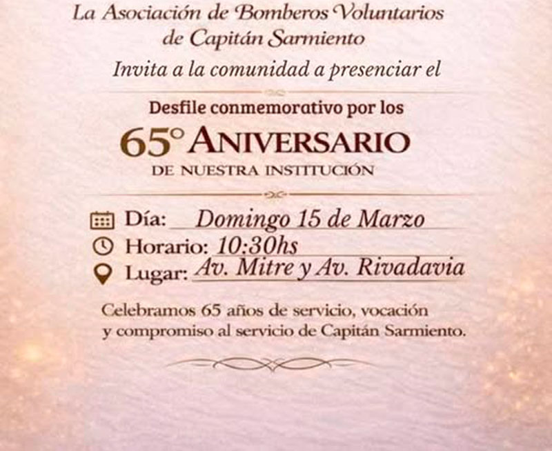 ¡Felices 65 años, Bomberos Voluntarios de Capitán Sarmiento! Gracias por seis décadas de entrega, valentía y servicio incondicional cuidando a nuestra comunidad con el corazón. Son un verdadero orgullo. ¡Felicitaciones y muchas gracias!